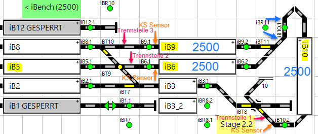 Wir 2-Leiter Bahner haben mit den Kehrschleifen einen kleinen Extra-Challenge. Die Strecke vom KS-Sensor bis zur gegenüberliegenden Trennstelle muss etwas länger sein als der längste Zug. Ansonsten droht ein Kurzschluss, bereits von einer einzelnen Achse. Ich verwende Block- und Zuglängen in RR. Meine maximale Zuglänge beträgt 2500 mm, das heisst eine Kehrschleife muss bei mir mindestens 2500 mm lang sein. Leider habe ich aber eine Kehrschleife wo der entsprechende KS-Block iB10 (siehe Abb. Planausschnitt) mit 1884 mm zwischen Trennstelle 1 und blauen Pfeilen zu kurz ist. Deshalb habe ich die beiden Blöcke iB6 und iB9 zusätzlich in die Kehrschleife einbezogen. Auf diese Weise übertreffe ich die 2500 mm Länge für beide Wege iB10-iB6 (Trennstelle 1 - Trennstelle 2), sowie iB10-iB9 (Trennstelle 1 - Trennstelle 3) durch die Kehrschleife. Die Sensoren und Trennstellen bei den blauen Pfeilen entfallen.