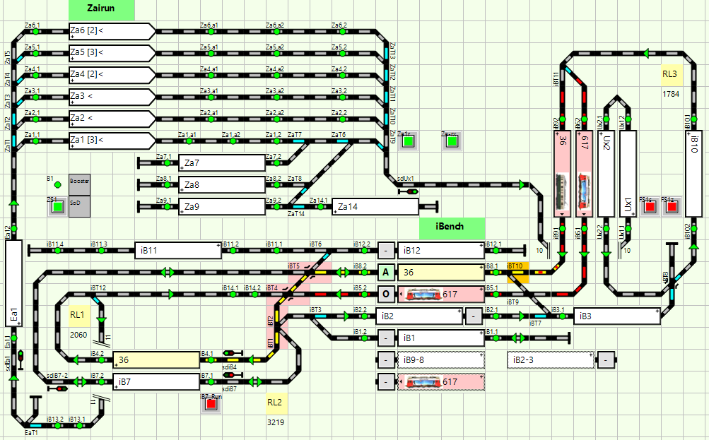 - Zug 36: Steht im Block iB9. Zug 36 hat eine FS nach iB4 reserviert, mit iB8 als kreuzenden Block; sichtbar an den gelb hinterlegten Blöcken und den weiteren reservierten Weichen. Zug 36 kann jetzt also die Weiche iBT10 befahren und Zug 617 überholen.
