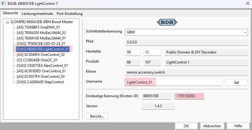 Voraussetzung: Es muss bereits eine BiDiB-Zentrale eingerichtet sein mit selbstgewählter Schnittstellenkennung (in meinem Fall "GBM").