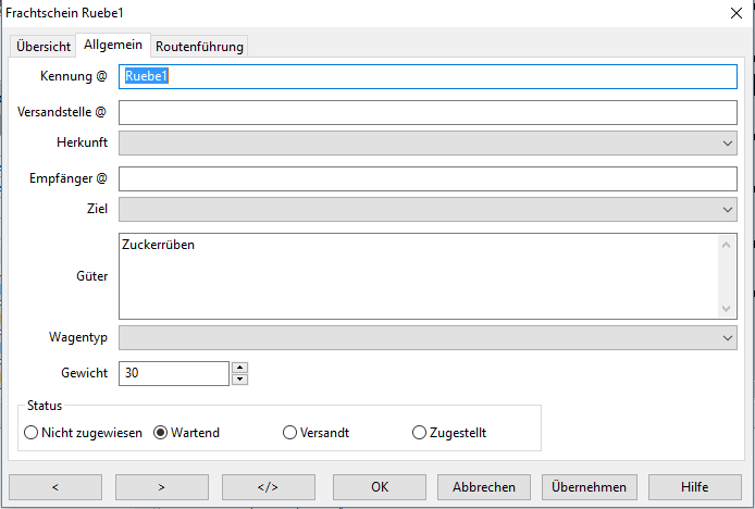 Das Einstellen des Status hat in diesem Dialog keinen Einfluss auf die Zuweisung des Frachtscheins zu einem Wagen.