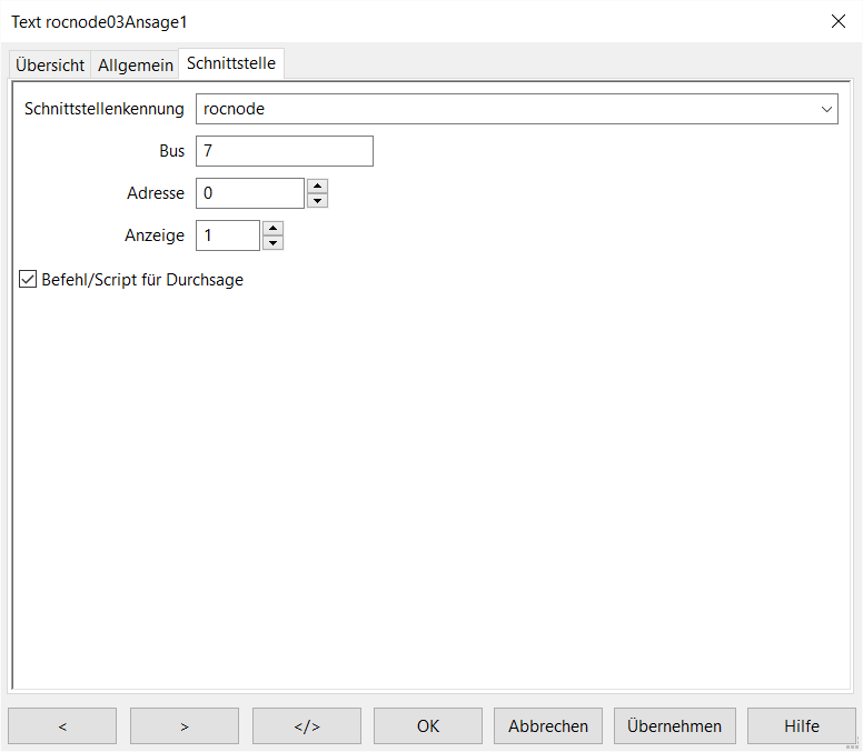 Die erstellte Aktion kann nun an einen Block angehängt werden und so die Einfahrt des Zuges in den Bahnhof ankündigen. Sie kann aber, auch zum Testen, an einen Ausgang gehängt werden. Wir erstellen dazu einen Ausgang und konfigurieren ihn wie erfolgt