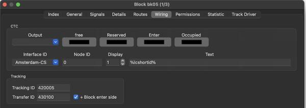 So that a block can inform the ZNF server about the allocation, block must get an entry in the tab Wiring CTC / Interface ID and Display, in addition the trackingID and if necessary a transferID. The trackingID is used as address for sending, the transferID processes received telegrams. Only train movements are reported. Blocks that are only used for shunting do not get a trackingID. A (shunting) locomotive that only moves within the interlocking district does not need a shortID.